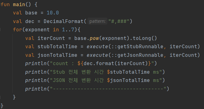 측정 과정은 앞서 시나리오대로 단계별 변환 횟수에 맞추어 변환 작업을 수행하며, 단계별 최초 50회는 warm up 단계로 구성하여 결과에서 제외한 총 수행시간을 반환하도록 작성했습니다.
