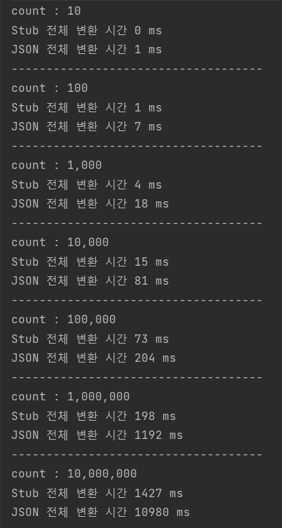 그렇다면 실제 Protobuf 변환 과정과 JSON 변환 과정을 측정해보면 얼마나 유의미한 결과를 나타낼까요? 테스트를 통해 차이가 얼마나 발생하는지 살펴봅시다.