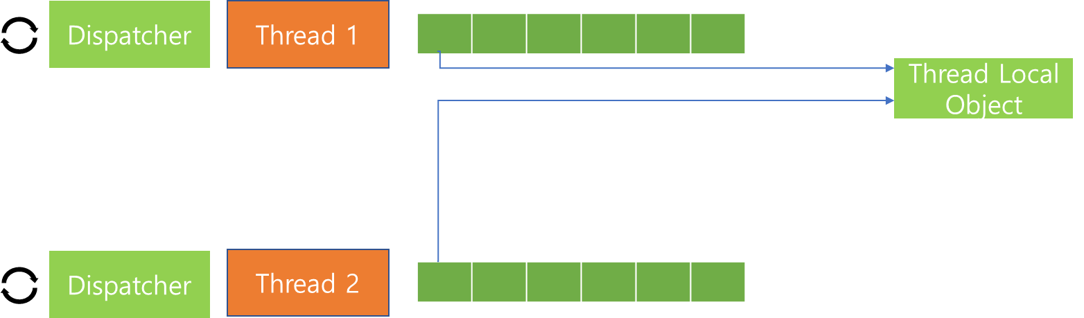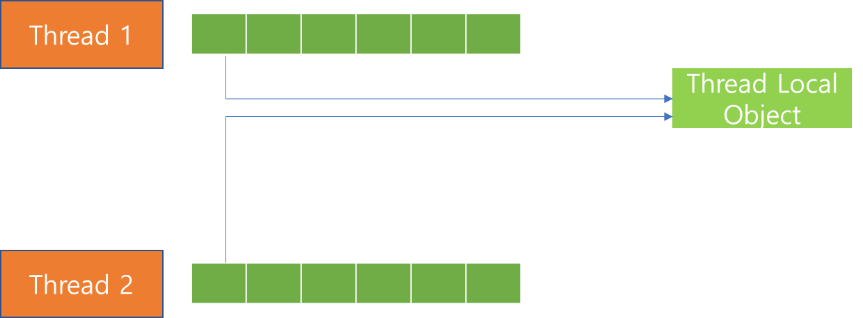 위와 같이 설계된 디자인에서는 쓰레드 외부간에는 데이터가 공유되지 않지만, 내부에서는 해당 데이터를 전역적으로 공유해서 사용할 수 있습니다. 이러한 기법을 Thread Local이라고 부릅니다.