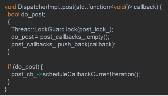 위 코드를 통해서 방금 전 설명한 내용처럼 Dispatcher의 post를 통해서 Callback Event가 전달되면, 바로 처리하지 않고 내부에 존재하는 post_callbacks_ 자료구조에 해당 callback 함수를 저장하는 것을 확인할 수 있습니다.