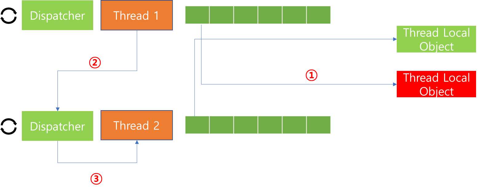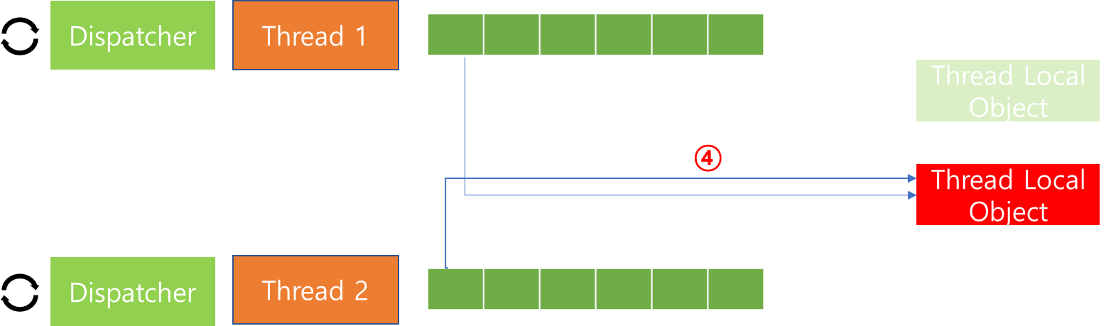 Client는 Slot을 할당 받으면, Thread Local에 저장하기 위한 Callback Event를 등록할 수 있습니다. 이때 위 코드와 같이 set 메소드를 통해 저장할 수 있으며, 코드 내용을 자세히 살펴보면, 등록된 Thread를 모두 순회하면서 dispatcher에게 post 메소드를 호출하여, 각자 쓰레드가 보유한 setThreadLocal을 호출하도록 요구하는 것을 볼 수 있습니다.