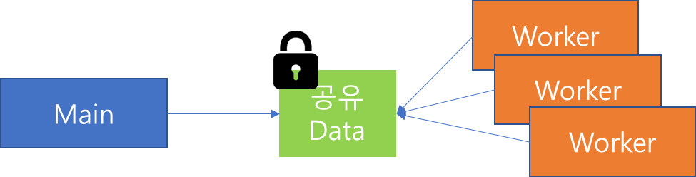 첫 번째로 생각해볼 수 있는 방법은 쓰레드간 공유 Data를 생성한 다음에 Main 쓰레드에서 데이터 변경이 필요한 경우 Worker 쓰레드가 해당 공유 Data 접근이 모두 끝나는 시점에 Exclusive Lock을 걸어 Worker 쓰레드의 접근을 일시적으로 차단한 다음 데이터를 변경하여 쓰레드 안정성을 확보하는 방법입니다. 하지만 위와 같은 방식은 동시성이 떨어지는 단점이 존재합니다.