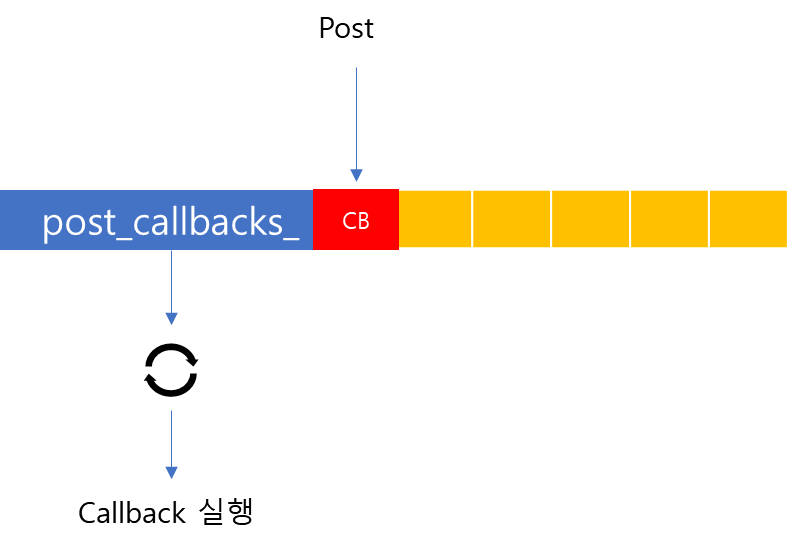 해당 메소드의 역할을 살펴보면, post_callbacks_에 저장된 내용이 하나도 없을 때까지 Event 내용을 하나씩 꺼내서 실행시키는 역할을 수행합니다. 이후 모든 작업이 완료되면, 향후 Post 메소드를 통해 Event가 유입될 때까지 작업을 진행하지 않습니다.