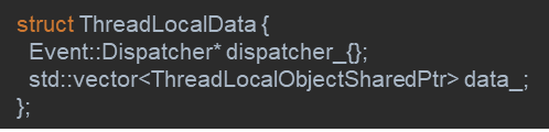 위 코드는 각 쓰레드별로 저장되는 TLS 구조의 모습입니다. 해당 구조체에는 각 쓰레드별로 구동되는 Dispatcher 정보를 저장할 수 있는 속성과, 이전 코드에서 확인한 ThreadLocalObject를 Shared Pointer로 감싼 타입을 Vector Container로 가지고 있는 것을 확인할 수 있습니다.