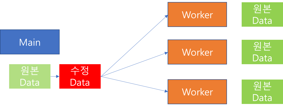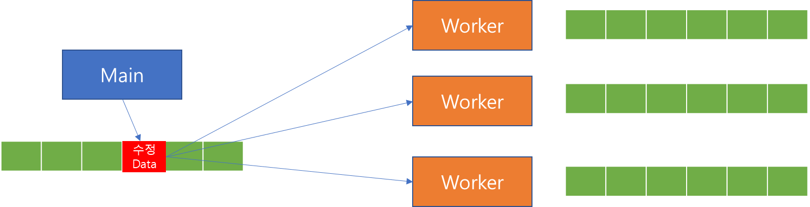 두 번째 방법은 모든 쓰레드에 걸쳐 동일한 데이터를 가지고 있는 상태에서 Data 변경이 발생하면, Main 쓰레드에서 데이터를 변경한 다음 모든 Worker 쓰레드에 수정된 Data를 전달하는 것입니다. 이 경우에는 특정 Worker 쓰레드가 바라보고 있는 원본 Data에 대해 Main 쓰레드에서 수정을 가해도 Worker 쓰레드가 바라보는 원본 Data는 해당 시점에 변경되지 않기 때문에 쓰레드 안정성을 확보할 수 있습니다.