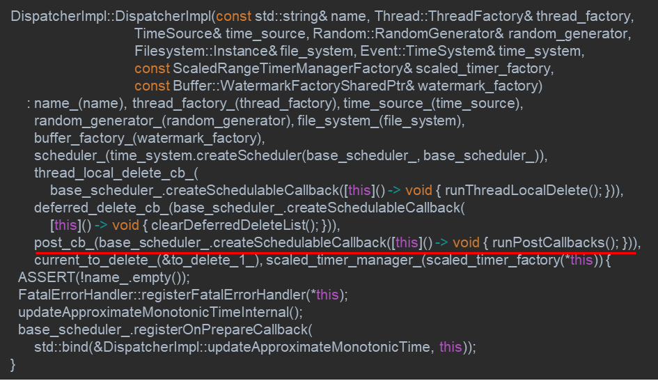위 코드는 Dispatcher의 생성자 부분입니다. 여기서 Dispatcher를 구성하기 위해 다양한 속성들이 Member Initializer에 의해서 매핑되고 있지만, Event 전달 관점에서 주목할 부분은 빨간색으로 밑줄 친 영역입니다.