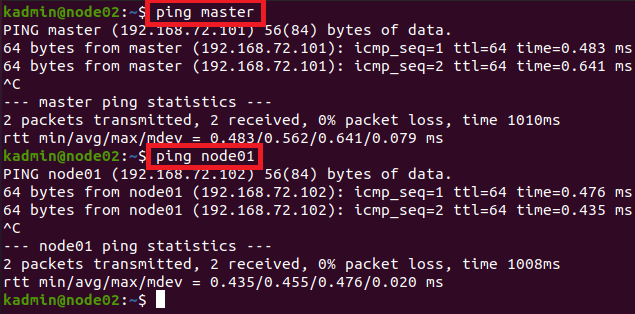 (※ Master 뿐만 아니라 Work1, Work2 가상 머신에서도 Ping을 수행하여 패킷이 정상 수신되는지 확인합니다.)